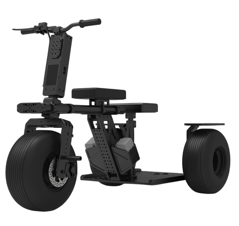 Custom Easy Raptor Trike is a versatile electric vehicle for professional filmmaking. Used by Steadicam operators or with stabilised remote heads. Features a robust build with adjustable components for operator comfort – including a flat seat, integrated footrest, and tunable wheel alignment. Dual DeWalt Flexvolt batteries power the trike up to 30 km/h in drive mode and 8 km/h in reverse. Compatible with various accessories, such as mounting kits and Mitchell risers, making it adaptable for different camera setups.