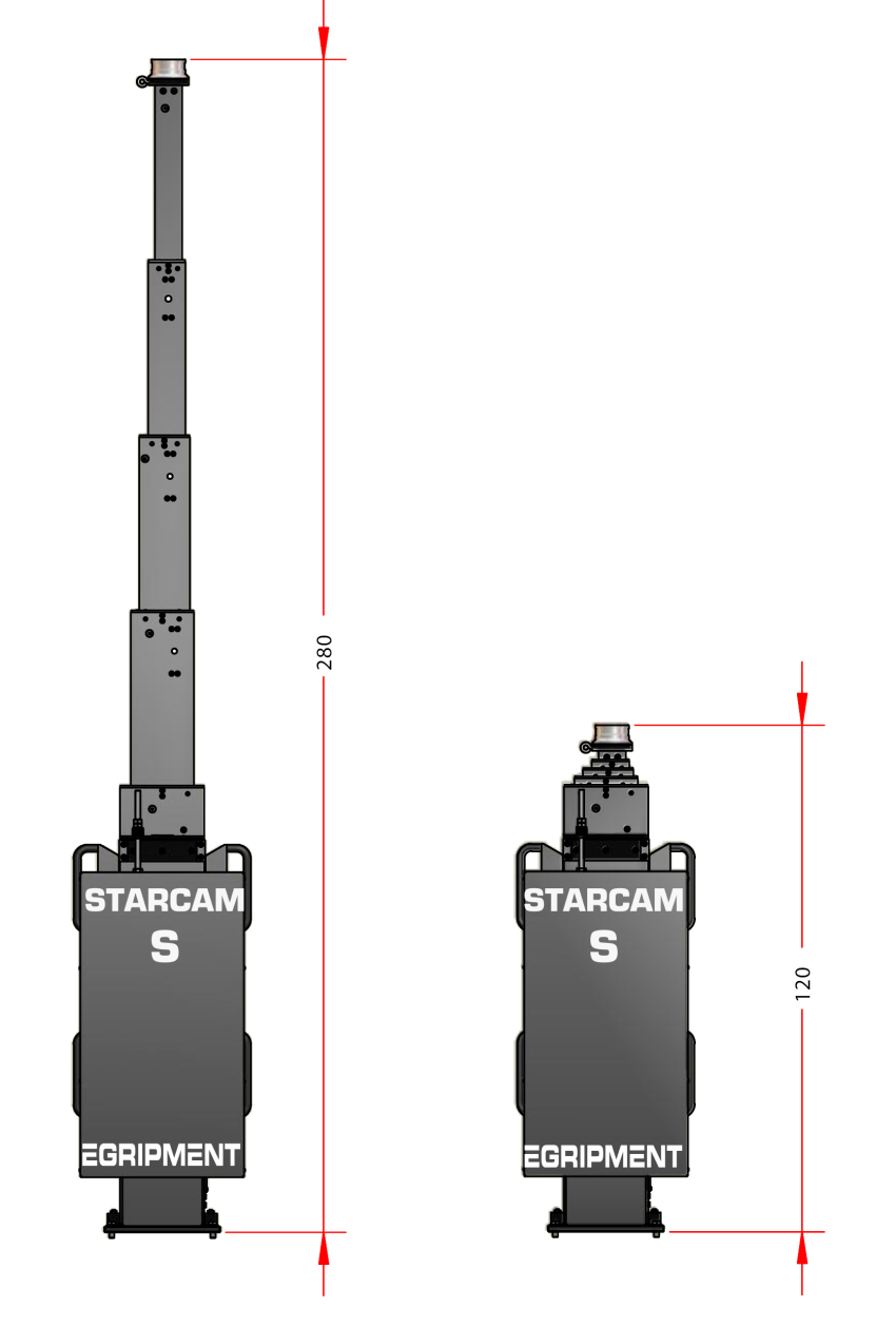 Egripment Starcam Towercam S is a telescopic column with a maximum height of 9′ and lowest height of 4′. Controlled via a rocker or foot pedals for a typical broadcast environment. Comes complete on its own custom made moveable base with track wheel adaptors to fit directly onto standard dolly track. Conventional overslung mode can be used but with a specifically designed plate, the system can be underslung from a suitable structure.