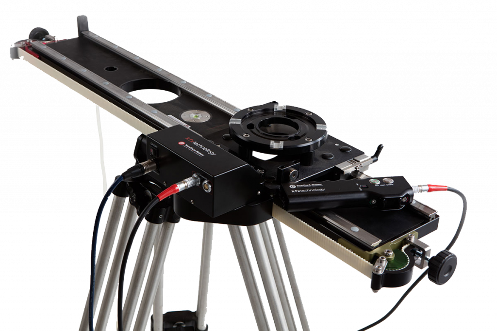 KFX Motorised Slider is a high-performance motor for professional filmmaking. Offers smooth and precise camera movements with plug-and-play operation, programmable end stops, and adjustable ramping for controlled starts and stops. Variable speed control and compatibility with various slider lengths enable it to handle heavy payloads both horizontally and on inclines. The system is mountable on both Ronford Baker Sliders and GFM Sliders.